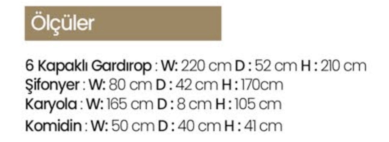 | Takım İçeriği | 1 Adet Gardırop, 1 Adet Başlık , 1 Adet Şifonyer ve Aynası, 2 Adet Komodin, |